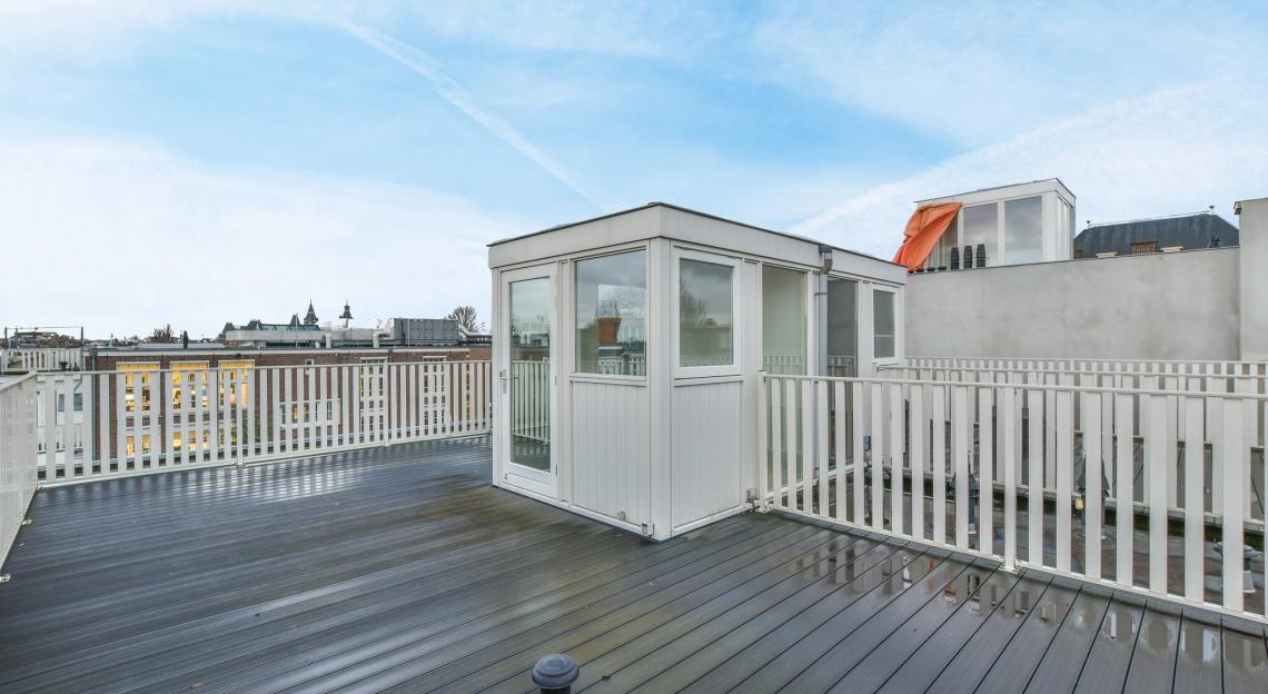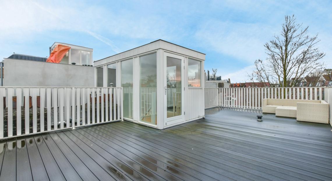 Ruim dakterras van circa 50 m2 met dakopbouw en pantry.