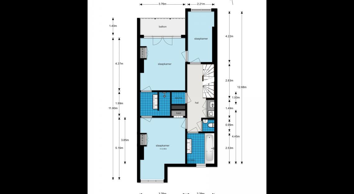 Drie slaapkamers, twee luxe badkamers, een sauna en een balkon aan de achterzijde.