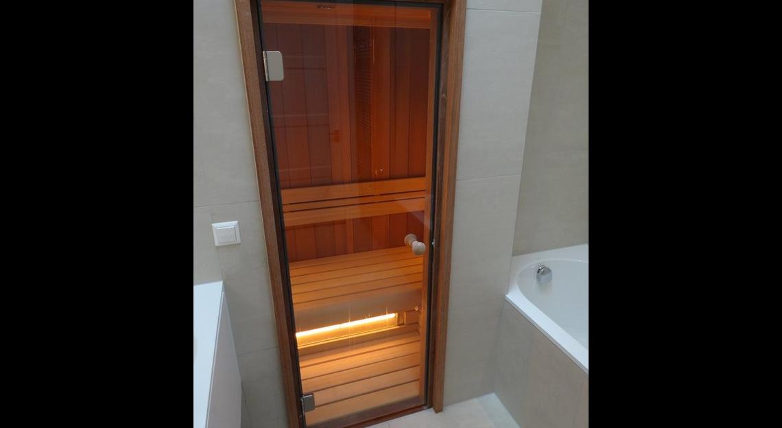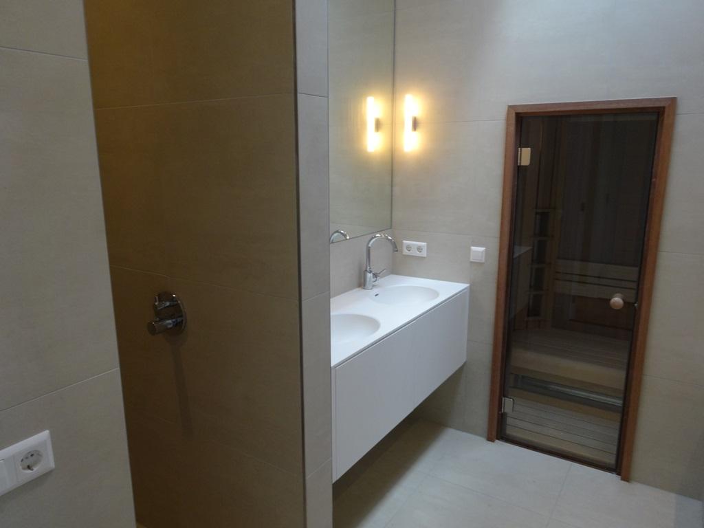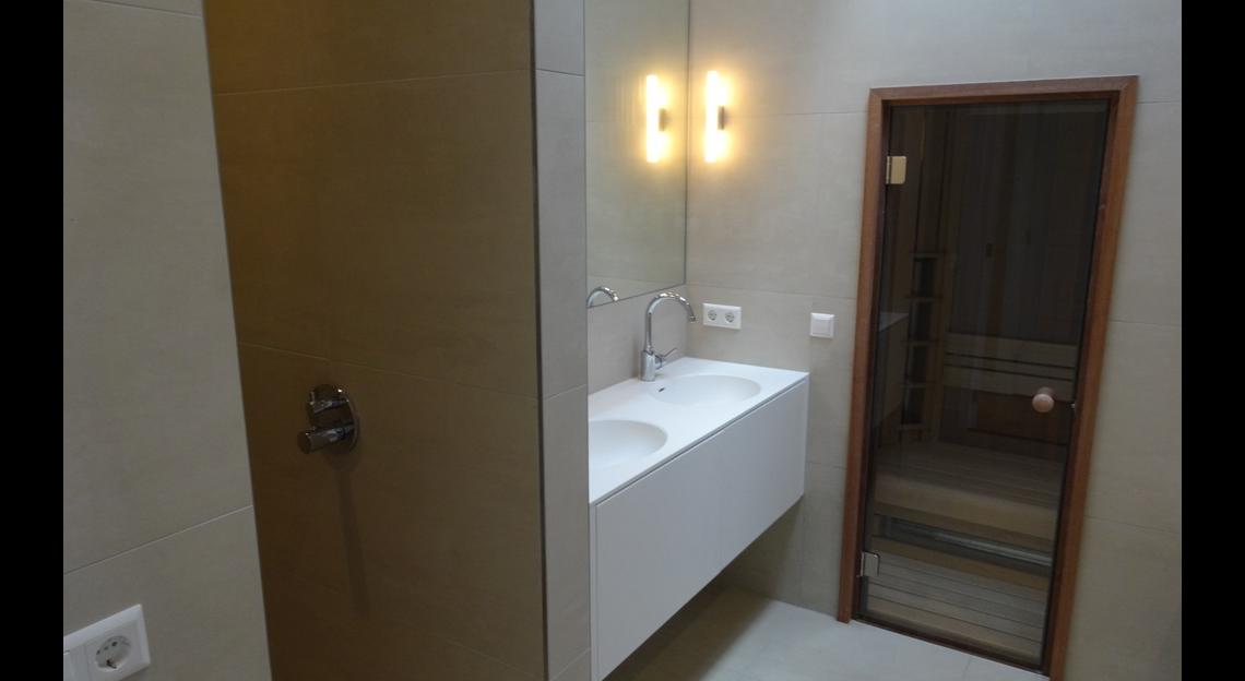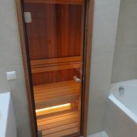 Zeer luxe badkamer met douche, bad en sauna.