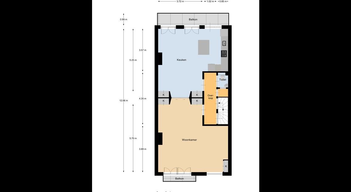 Eerste verdieping: riante woonkamer en eetkamer en suite met veel kastruimte, luxe open keuken met alle inbouwapparatuur, balkon met ochtendzon, hal, toilet en trap naar 2 hoog.